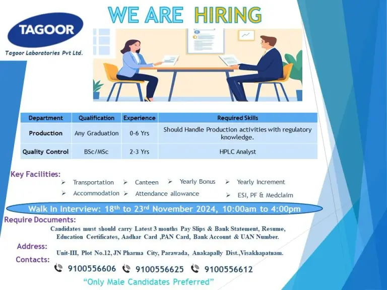 - Work Location: Unit-III, Tagoor Laboratories Pvt. Ltd, Visakhapatnam