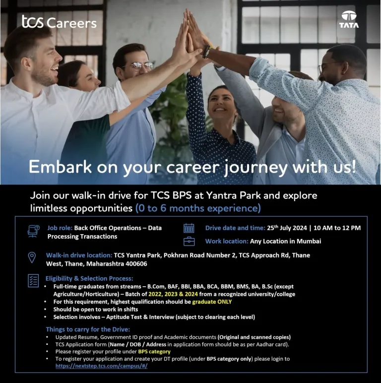 • Walk-in drive location: TCS Yantra Park, Pokhran Road Number 2, TCS Approach Rd, Thane West, Thane, Maharashtra 400606