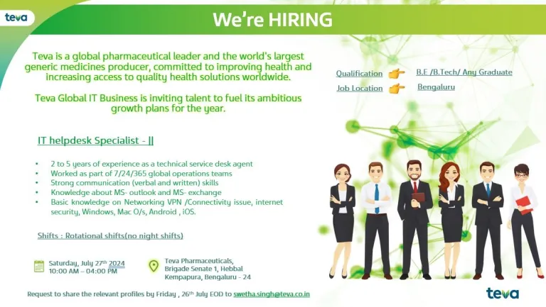- Venue: Teva Pharmaceuticals, Brigade Senate 1, Hebbal Kempapura, Bengaluru