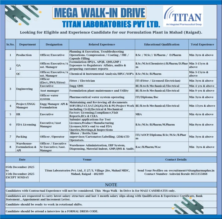 Mega Walk-In Drive at Titan Laboratories Pvt. Ltd. We are conducting a Mega Walk-In Drive for our Formulation Plant in Mahad (Raigad) and are inviting eligible and experienced candidates across multiple departments to join our growing team.
