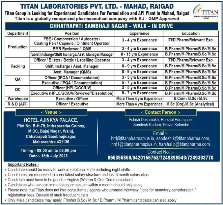 TITAN Group is looking for Experienced Candidates for FORMULATION & API Plant. Titan, an integrated Pharmaceutical Group which is backed by the holistic approach towards catering multifarious integrated services, which aims to meet the concept-to-commercialization needs of our customers while providing quality pharma and API products that serve for life saving medications.
