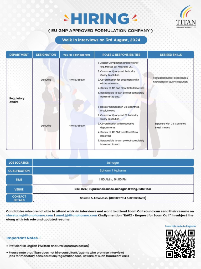 Titan Laboratories Pvt. Ltd is looking Please take note of the following information. The company is looking for qualified candidates for their Regulatory Affairs formulation plant situated in Juinagar, Mumbai. If you are interested, you can participate in the walk-in interview scheduled for August 3rd in Verna, Juinagar.