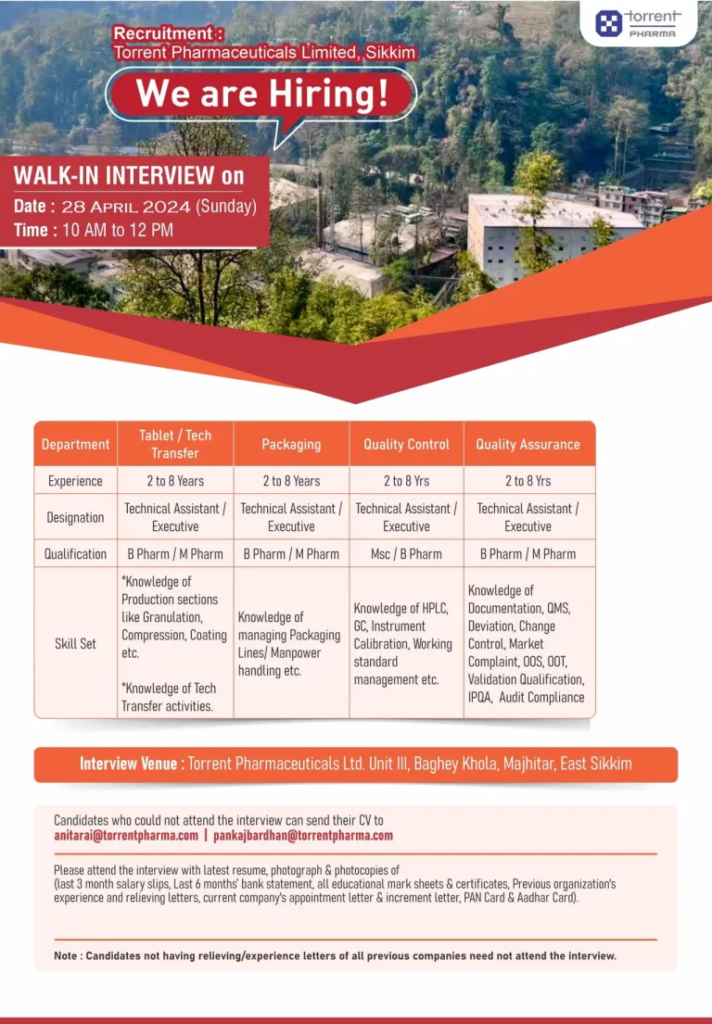• Candidates who could not attend the interview can send their CV to anitarai@torrentpharma.com / pankajbardhan@torrentpharma.com