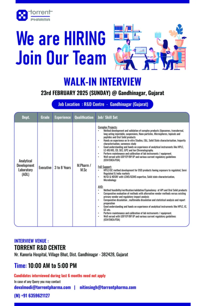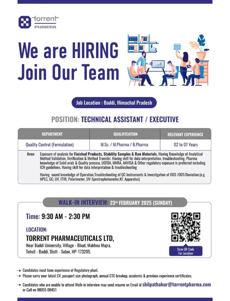 - Venue: TORRENT PHARMACEUTICALS LTD. Near Baddi University, Village – Bhud, Makhnu Majra, Tehsil – Baddi, Distt-Solan, HP-173205.