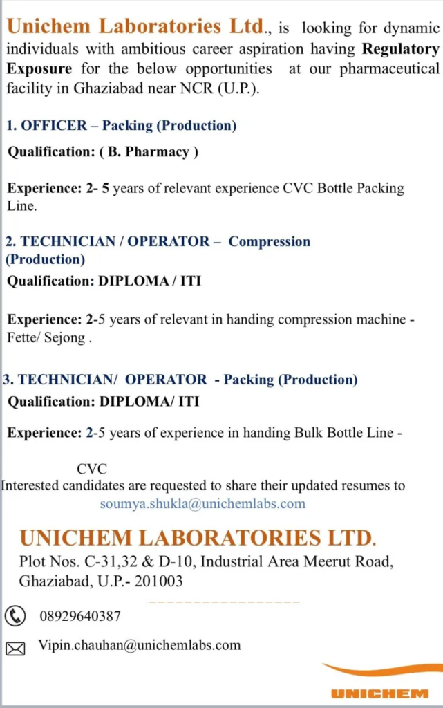 - Interested candidates are requested to share their updated resumes to soumya.shukla@unichemlabs.com