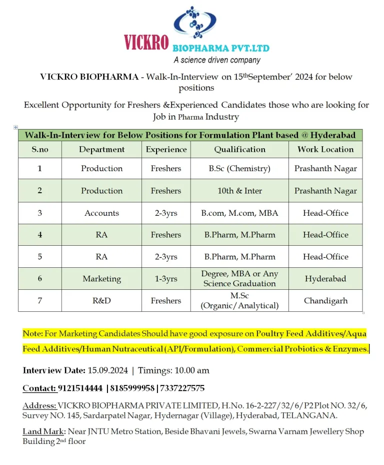 - Qualification: B.Sc, M.Sc, B.Pharm, M.Pharm, B.Com, M.Com, MBA, 10th, Inter