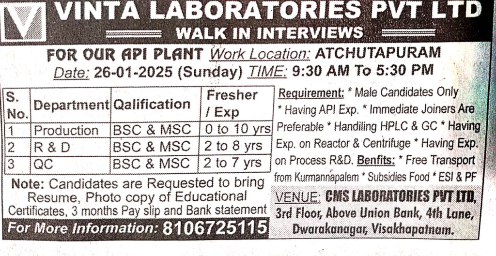 Interested candidates , may attend interview along with updated C’V. current (‘TO structure, 3 recent salary slips, documents of educational qualification and previous employments.Bank Statements