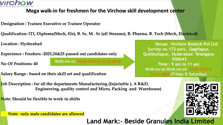 - Venue: Virchow Biotech Pvt.Ltd, Survey no.172part, Gagillapur, Quthbullapur, Hyderabad Telangana-500043