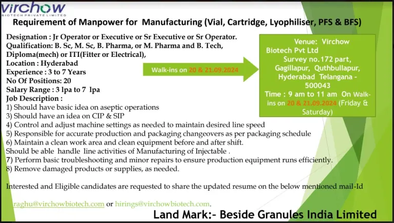 - Qualification: B.Sc, M.Sc, B.Pharm, or M.Pharm and B.Tech,