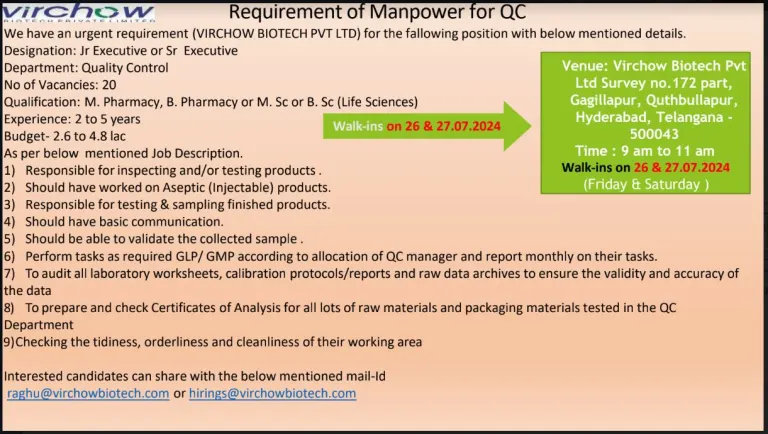 - Qualification: M. Pharmacy, B. Pharmacy or M.Sc or B.Sc (Life Sciences)