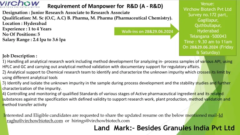 - Venue: Virchow Biotech Pvt. Ltd, Survey no.172 part, Gagillapur, Quthbullapur, Hyderabad, Telangana -500043