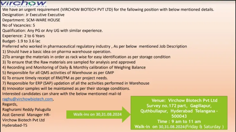 Interested candidates can share with the below mentioned mail-Id: raghu@virchowbiotech.com,