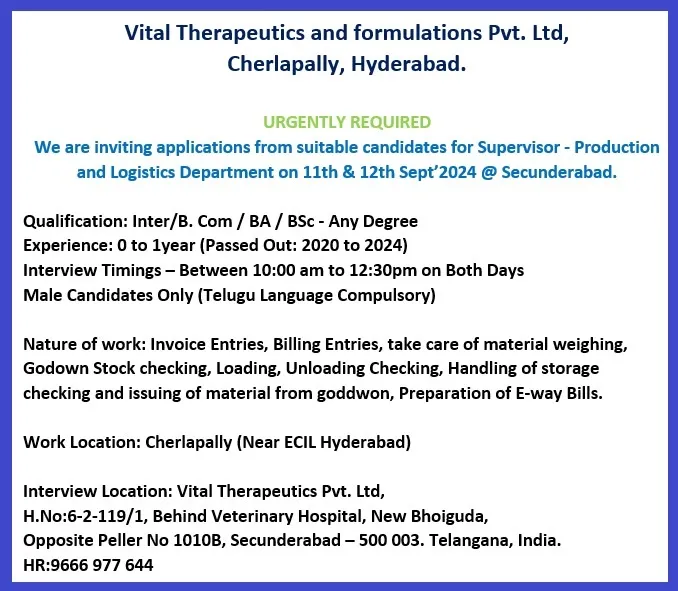 - Interview Location: Vital Therapeutics Pvt. Ltd, H.No:6-2-119/1, Behind Veterinary Hospital, New Bhoiguda, Opposite Peller No 1010B, Secunderabad – 500 003. Telangana, India.