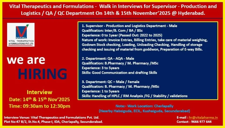 - Interview Venue: Vital Therapeutics and Formulation Pvt. Ltd. Plot No:47 B/2, St. No.4, Phase-I, IDA, Cherlapally, Secunderabad.