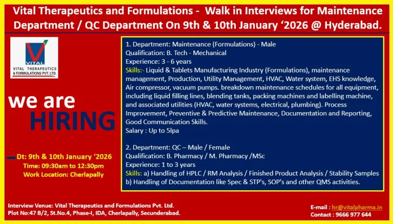 (Nearby Factory location Habsiguda, ECIL, Kushaiguda, Uppal, Secunderabad) - Interview Venue: Vital Therapeutics and Formulations Pvt. Ltd. Plot No:47 B/2, St.No.4, Phase-I, IDA, Cherlapally, Secunderabad.