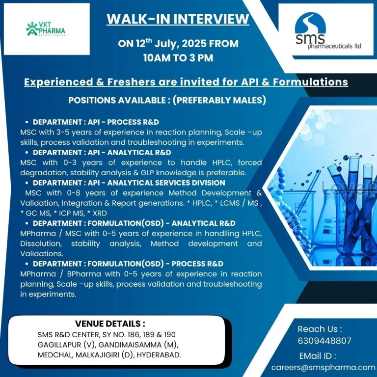 - M.Sc with 0-3 years of experience to handle HPLC, forced degradation, stability analysis & GLP knowledge is preferable.