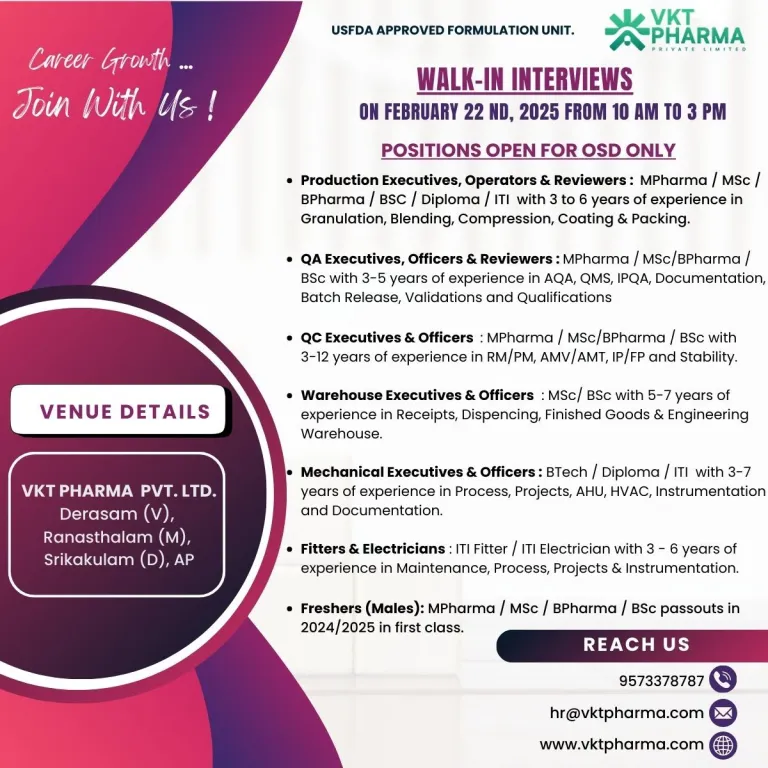- M.Pharmacy / M.Sc / B.Pharma / B.Sc / Diploma / ITI with 3 to 6 years of experience in Granulation, Blending, Compression, Coating & Packing.