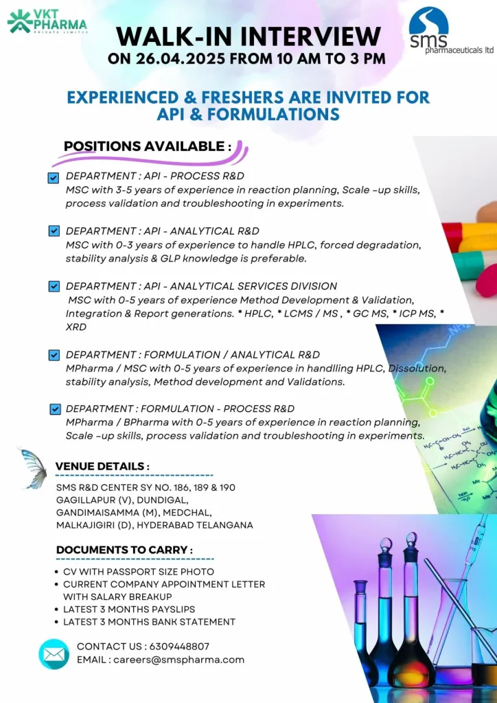 - M.Pharmacy/B.Pharma with 0-5 years of experience in reaction planning, Scale-up skills, process validation and troubleshooting in experiments.