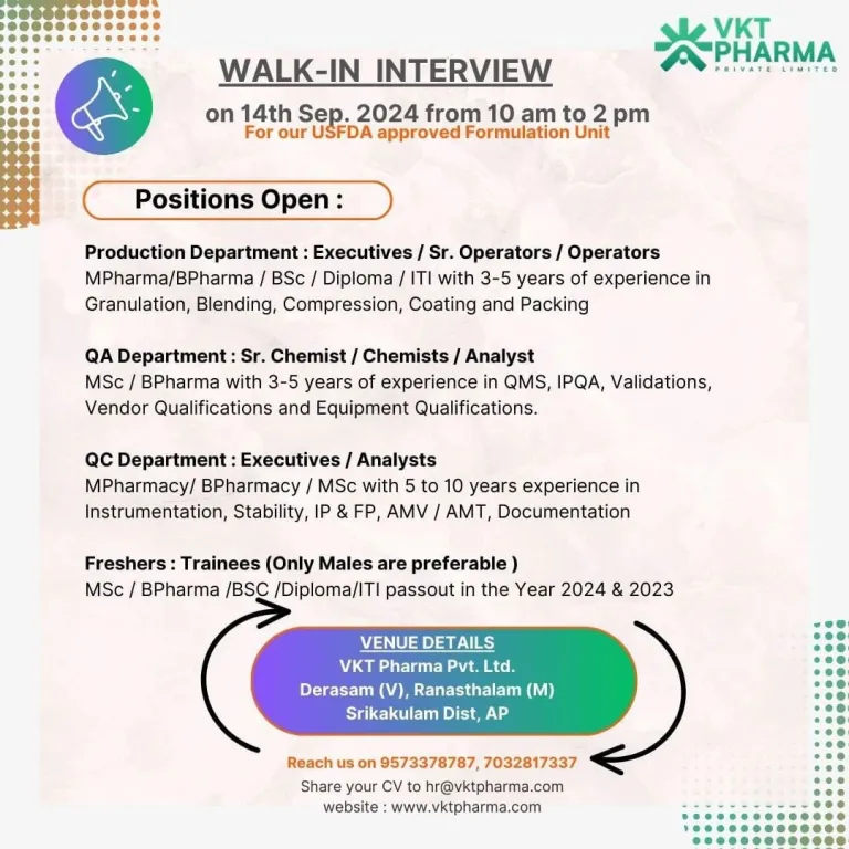 - M.Pharm / B.Pharm / B.Sc / Diploma / ITI