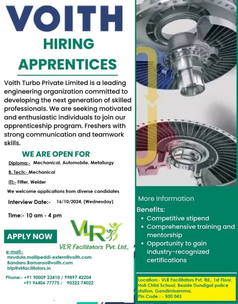 Voith Turbo Private Limited is a leading engineering organization committed to developing the next generation of skilled professionals. We are seeking motivated and enthusiastic individuals to join our apprenticeship program. Freshers with strong communication and teamwork skills. Voith Turbo Private Limited is associated with VLR Facilitators Pvt. Ltd for recruitment for bellow apprentice positions.