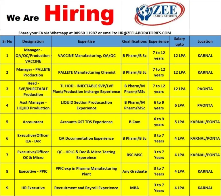 - Quality Control: B.Sc, M.Sc, B.Pharm, M.Pharm, MBA, B.Com, Any Graduate