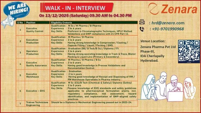 • Venue: Zenara Pharma Pvt Ltd, Phase-III, IDA Cherlapally, Hyderabad