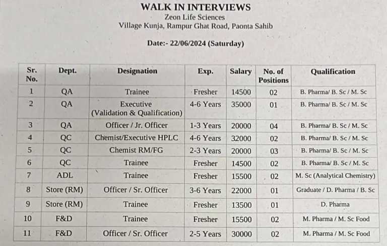 - Qualification: B.Sc, M.Sc, B.Pharm, D.Pharm, M.Pharm, Graduates