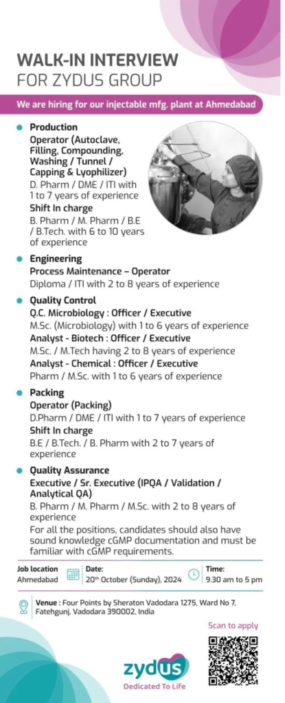 - Shift In charge – B. Pharm/M. Pharm/BE /B.Tech, with 6 to 10 years of experience