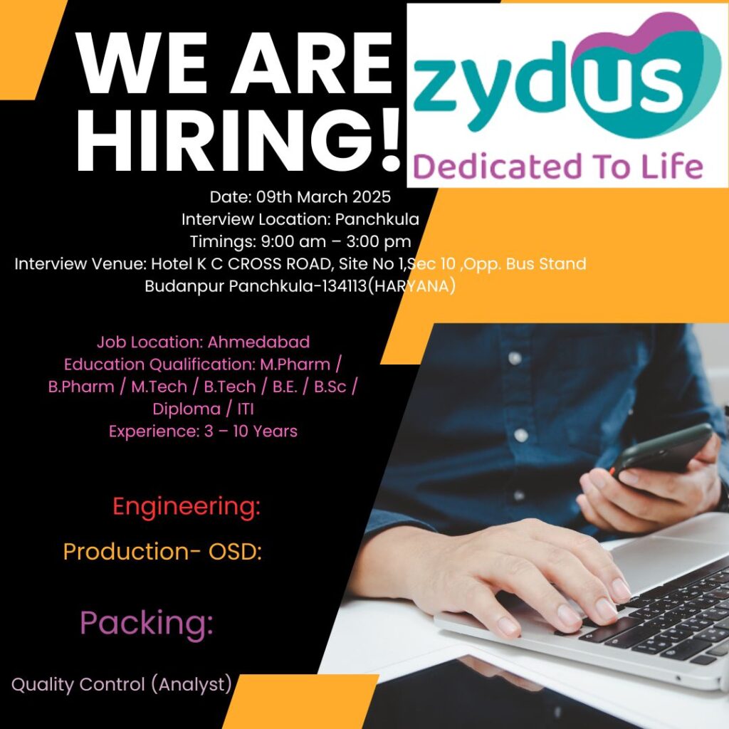 - Education Qualification: M.Pharm / B.Pharm / M.Tech / B.Tech / B.E. / B.Sc / Diploma / ITI